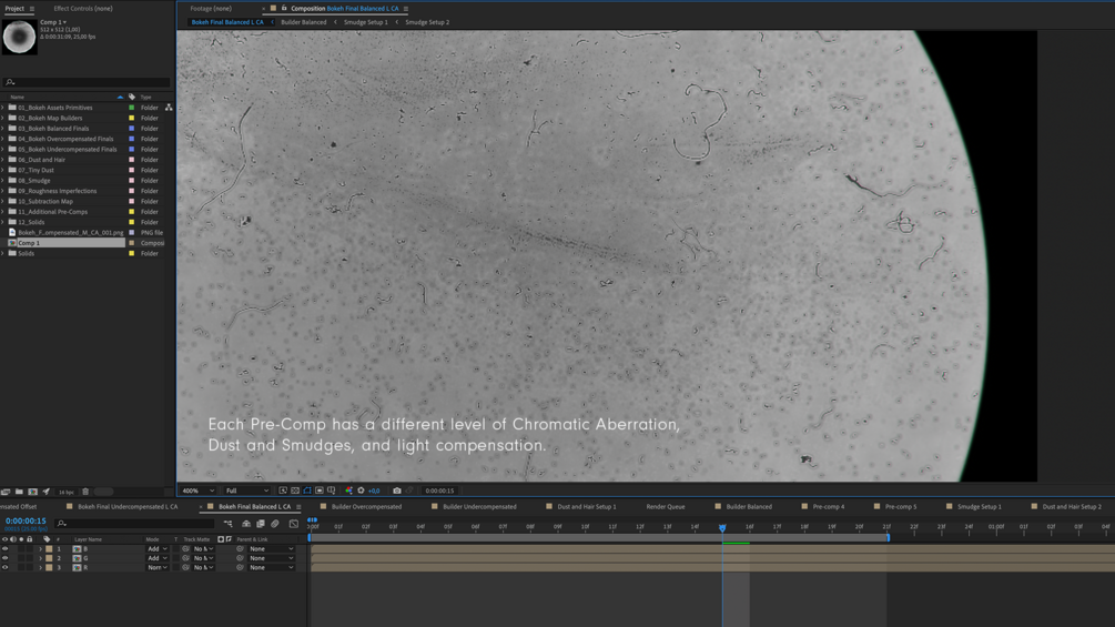 This pack provides a full variety of Bokeh presets, ranging from under-compensated to over-compensated, with or without chromatic aberration and with a variety of lens smudges and aperture shapes.