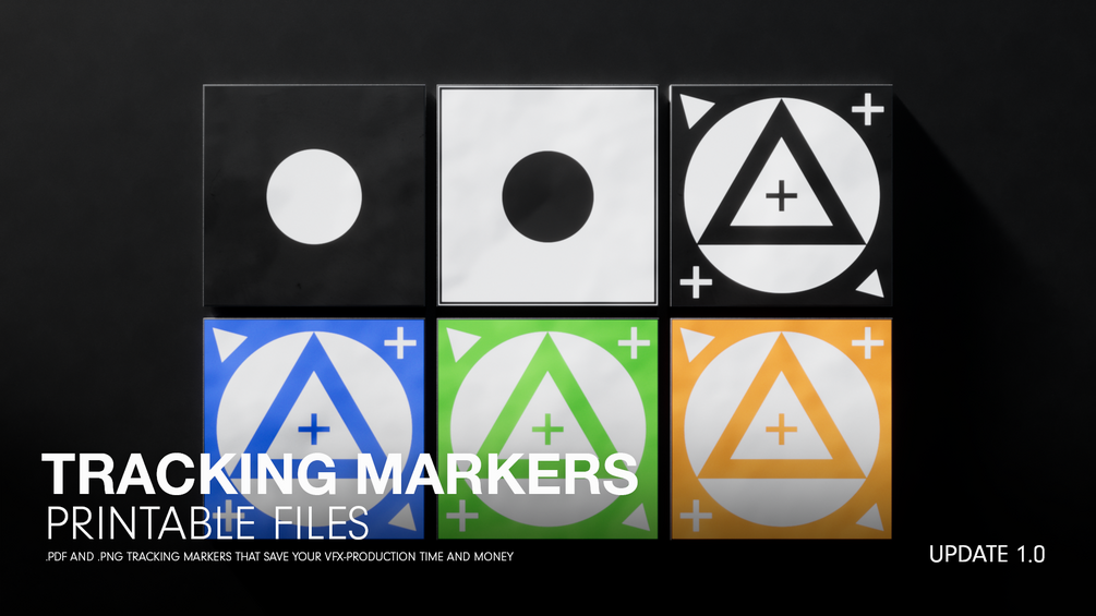 Printable tracking markers with clear graphic design for most basic use cases on set.